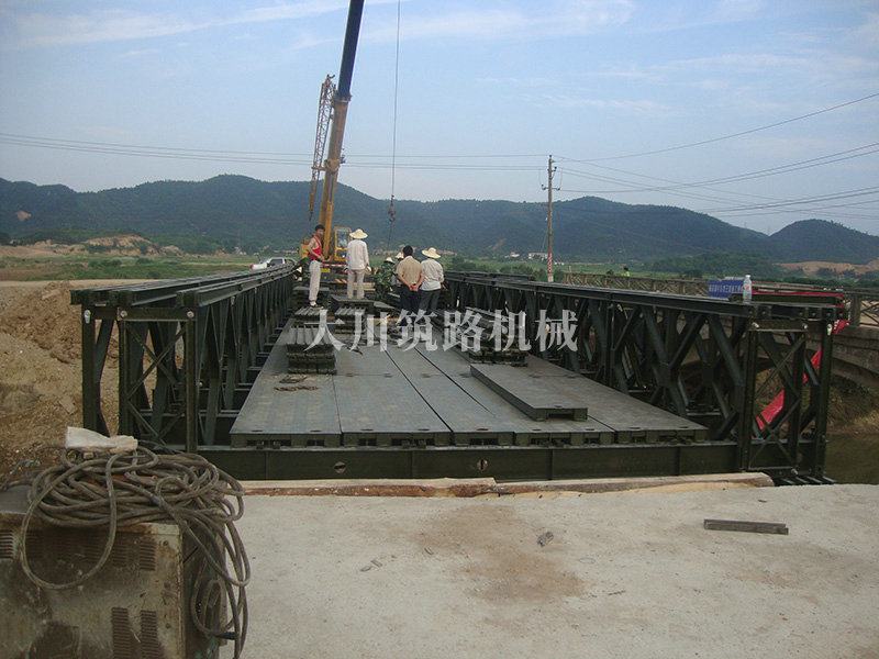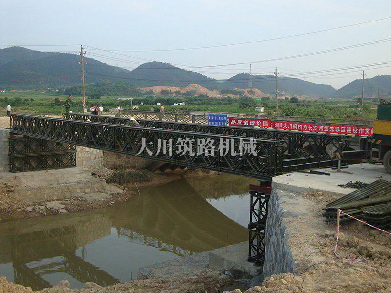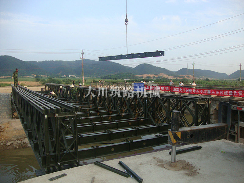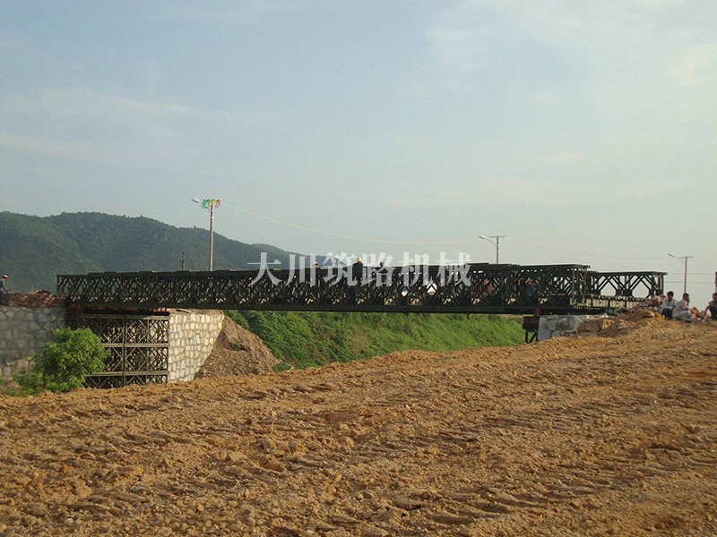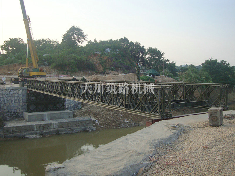 特點(diǎn):本鋼橋由國防科技大學(xué)全程指導(dǎo)和監(jiān)督安裝,滿足荷載80T施工車輛通行,因施工場(chǎng)地要求,采用貝雷梁組合式橋墩,安裝拆除方便,穩(wěn)定性好。采用推出法安裝,安裝周期20天,于2011年5月25日通車。