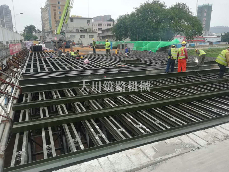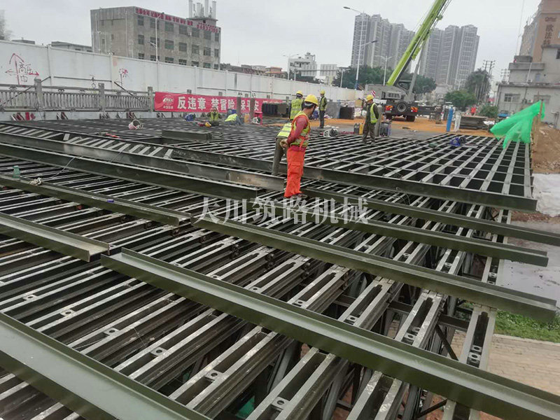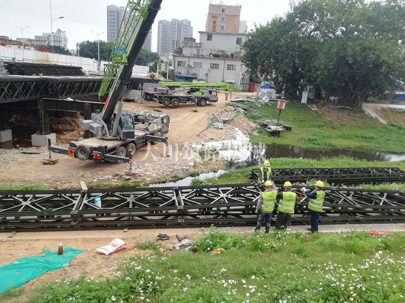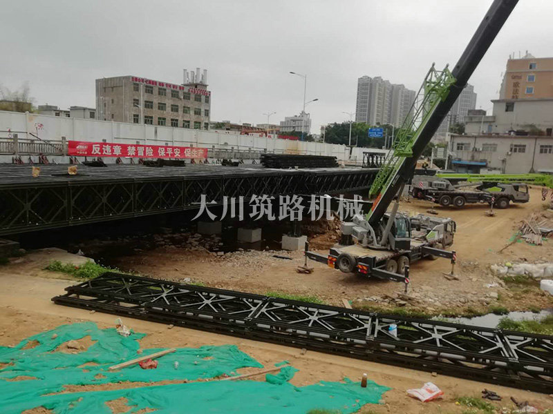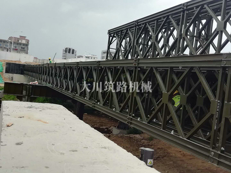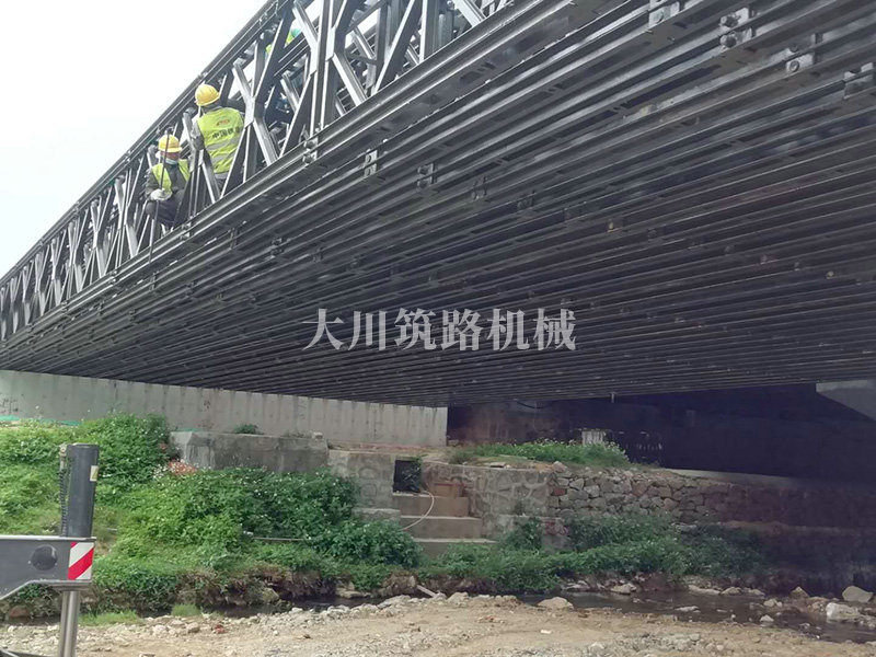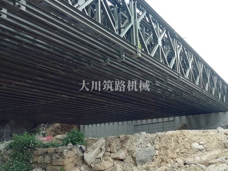 鋼橋型號:48m*16m加強型6(車道)+2(人行通道)+防撞護欄,上承式鋼橋,橫向布置35排貝雷梁,分兩跨,橋墩為單排四柱式φ800鋼管樁,上表鋪混泥土。